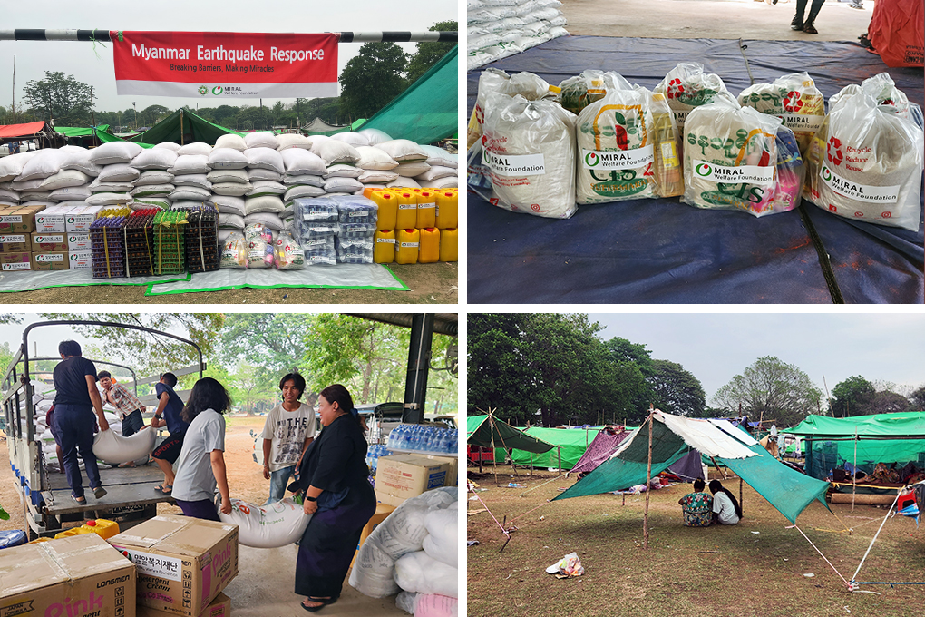 미얀마 이재민 2,000명을 대상으로 쌀 6,000kg,식용유 320kg, 달걀 2,400개 등의 식료품 및 비누 400개, 세탁세제 400개, 생리대 400팩 분량의 위생용품을 먼저 지급했습니다. 배분 장소는 만달레이 다운타운에서 차량으로 약 30분 거리에 위치해 있는 아마라푸라 타운십입니다. 아마라푸라는 일용직 등의 직업을 가진 현지 저소득층이 거주하고 있는 지역으로, 만달레이 도심보다 지진 피해가 심하며 다수의 이재민이 발생했습니다.