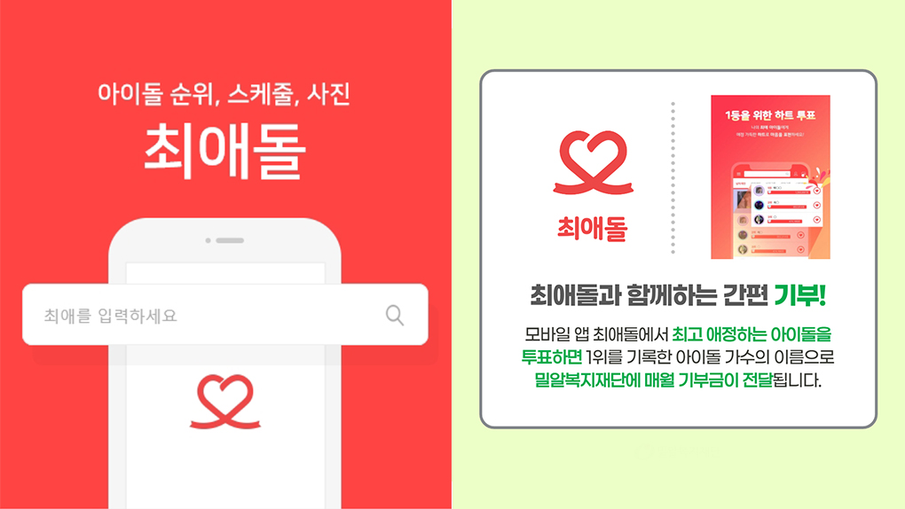 여러분이 가장 최애하는 아이돌은!? 하트를 통해 투표 순위를 올리고 사진, 영상 등을 공유하는 모바일 어플리케이션 '최애돌'이 벌써 밀알복지재단과 함께한 시간이 6년이 되었습니다. 2015년부터 약 6년동안 밀알복지재단에 매월 아이돌 이름으로 기부를 하고 있는 최애돌은 꾸준한 기부를 통해 6년간 1억 4,700만원의 기부금을 전달하였습니다.