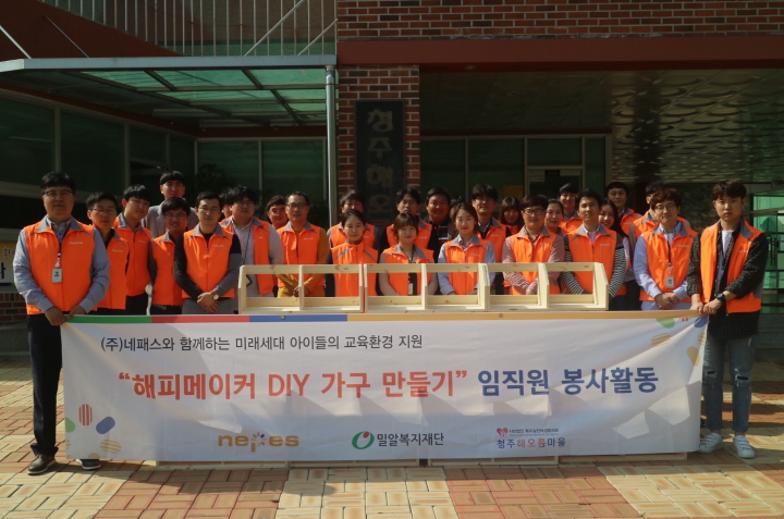 밀알복지재단 대전·충청지부는 네패스 오창2공장/오창캠퍼스와 함께 4월 19일 DIY 가구만들기 봉사활동을 펼쳤습니다. 19일 DIY 가구만들기에 참여한 35명의 임직원은 책꽂이를 직접 만들어 충북 청주지역의 장애아동 가정 및 여성·모자복지시설에 전달하였습니다.