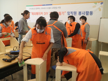 DIY 가구 만들기에 참여한 임직원은 “전문 강사로부터 목공품 제작 교육을 받고 열심히 책꽂이를 만들었습니다. 직접 만든 가구를 통해 아이들이 조금 더 즐겁게 공부하고 생활하기를 바란다.”고 소감을 밝혔습니다.