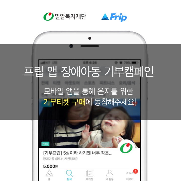 밀알복지재단은 소셜 액티비티 플랫폼 기업, 프립(Frip)과 함께 장애아동지원캠페인을 진행합니다. 캠페인은 프립 모바일 애플리케이션 플랫폼 내에서 진행되며 기부금전액은 희귀난치질환을 앓고 있는 아동의 수술비와 의료비로 지원될 예정입니다. 캠페인은 5월 15일부터 2주간 진행되며 프립 어플 내 [지식/나눔] 메뉴에서 참여(기부금 5천원)할 수 있습니다.