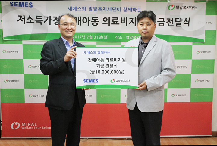 지난 7월 31일(월), 밀알복지재단에서는 반도체 및 디스플레이 제조 장비업체인 세메스의 ‘장애아동 의료비 지원 기금 전달식’을 진행했습니다. 세메스는 기업사회공헌 활동의 일환으로 밀알복지재단에 일천만원을 기부하여 어려운 형편 때문에 수술비를 마련하지 못해 어려움을 겪는 장애아동에게 희망을 선물하기 위한 활동에 동참했습니다.