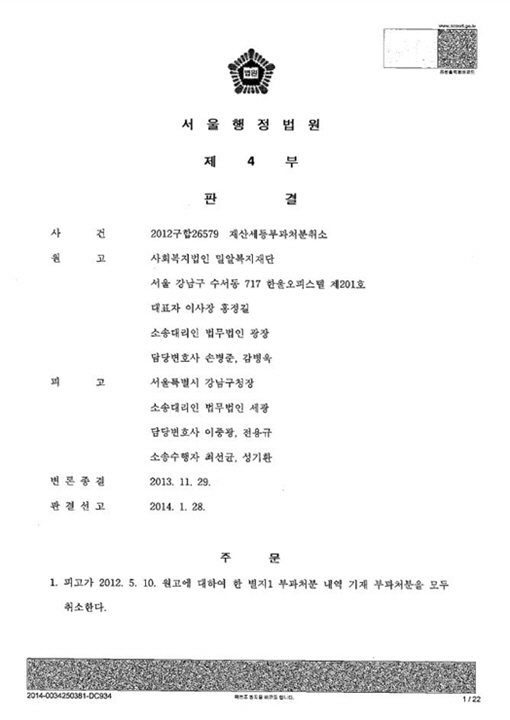 우리재단 밀알아트센터 사업과 관련하여 고유목적사업이 아닌 수익사업으로 보고 재산세를 부과한 조세당국의 처분이 부당하다는 법원 판결이 나왔습니다