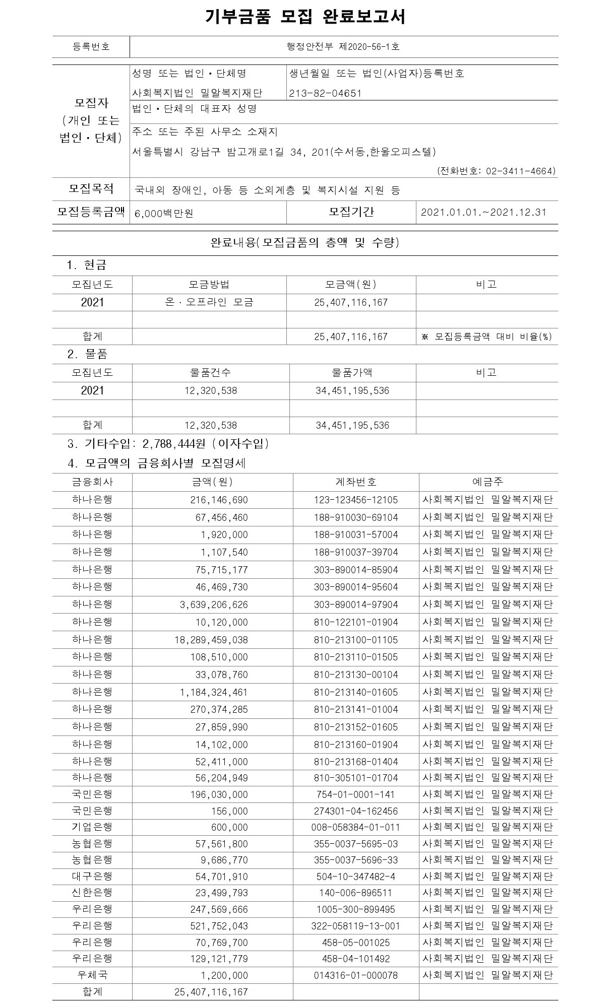 아래와 같이 기부금품을 모집을 완료했음을 보고합니다.