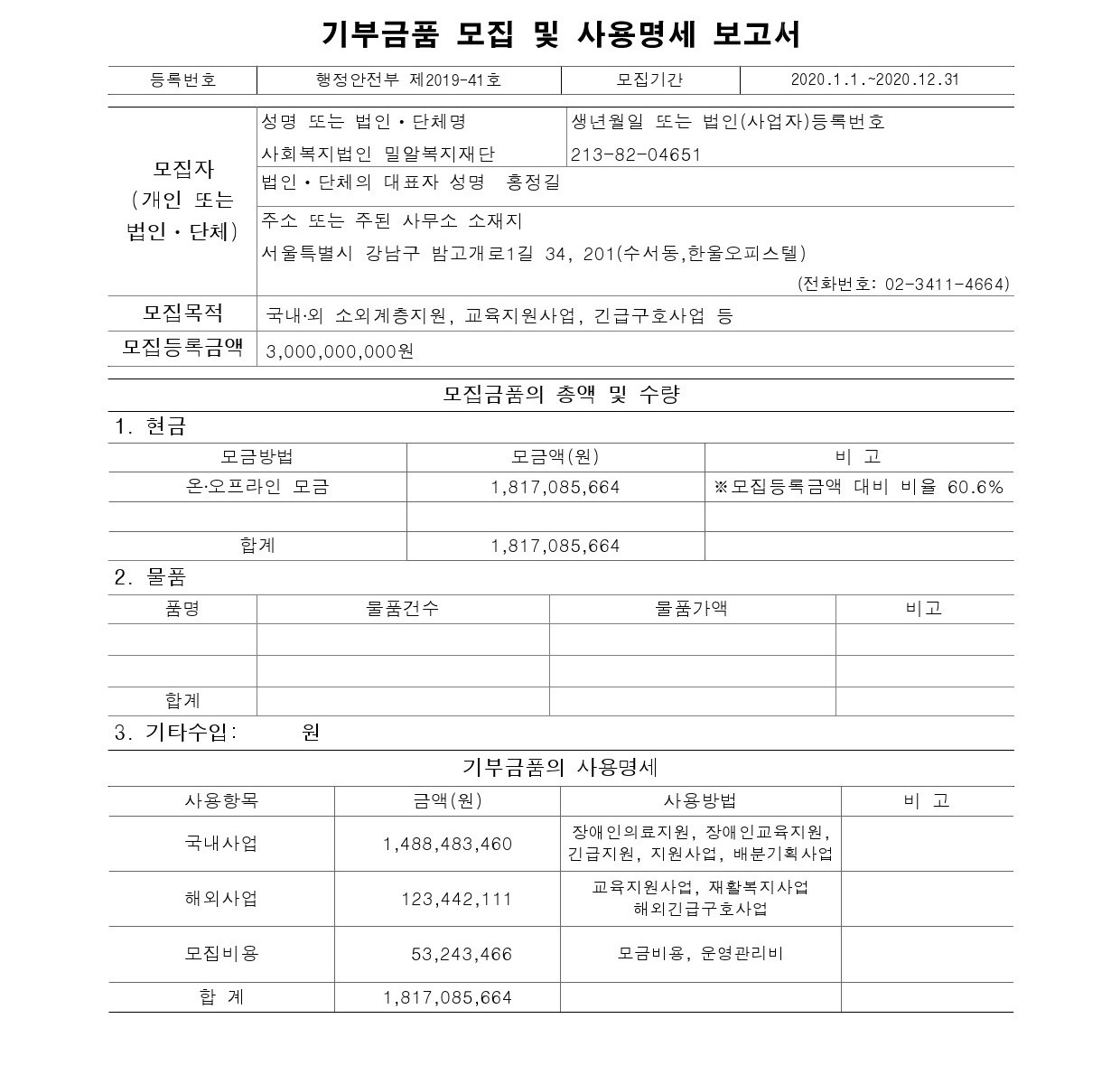 기부금품 모집 및 사용명세 보고(2020년도 귀속)