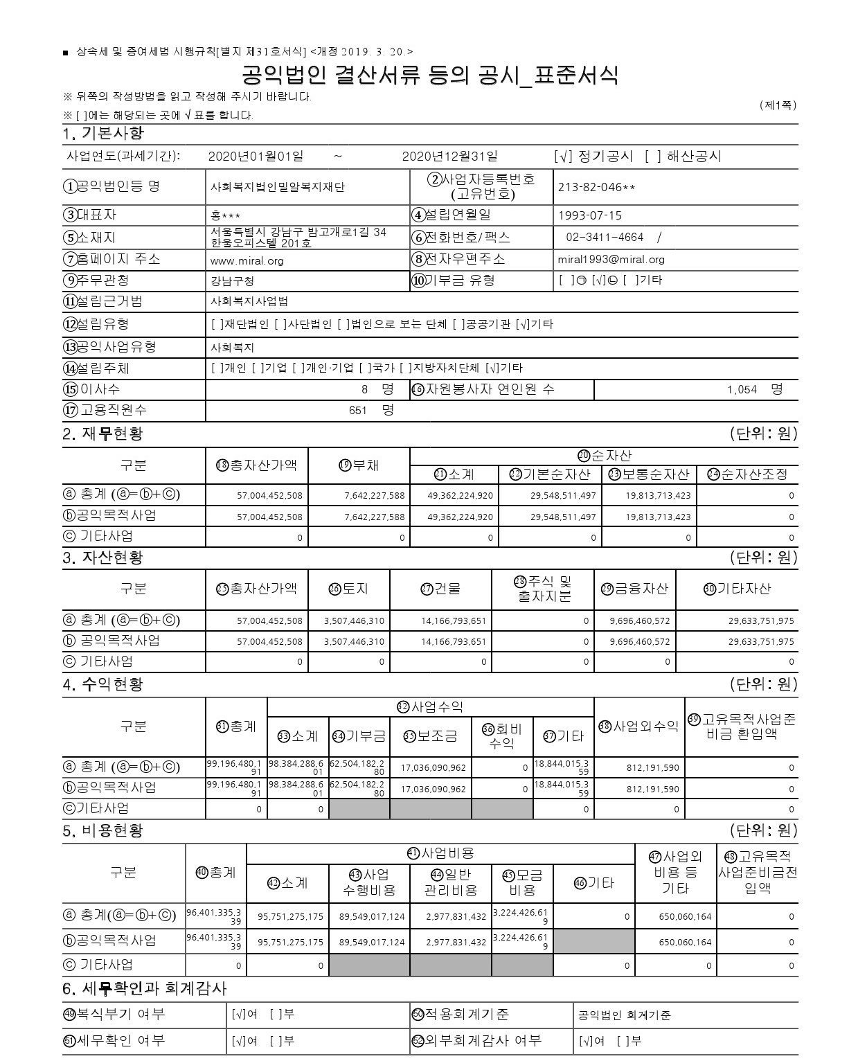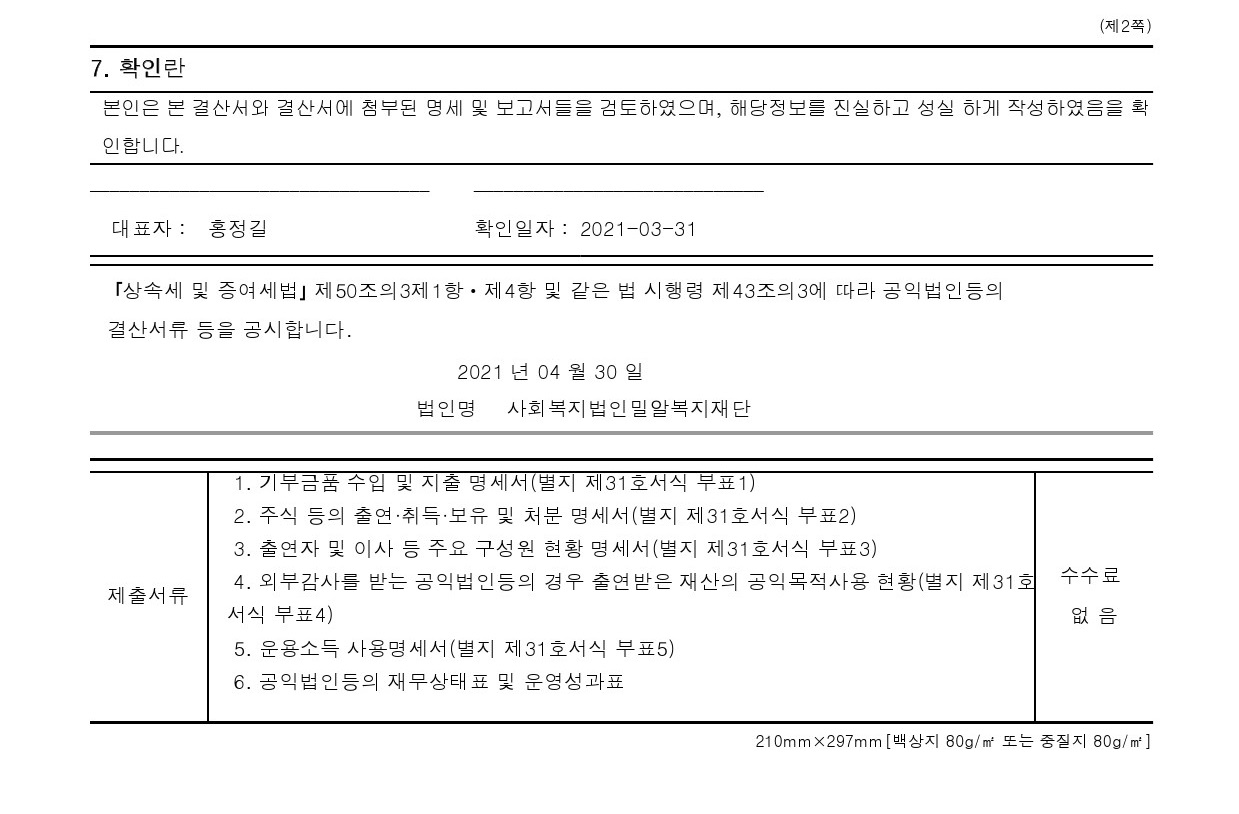 2020년도 「공익법인 결산서류 등」 및 「연간 기부금 모금액 및 활용실적」 을 보고합니다.