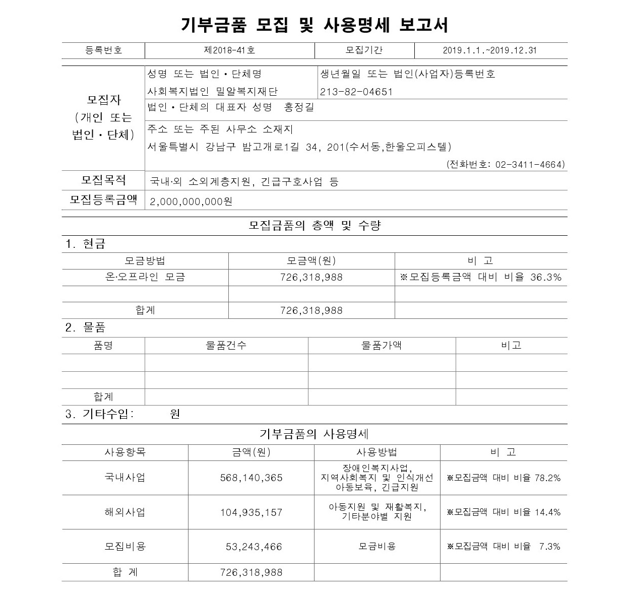 아래와 같이 기부금품의 모집 및 사용명세를 보고합니다.