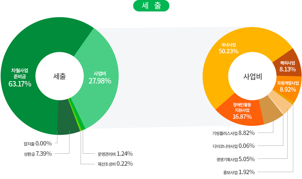 | 사업비 | 국내사업 | 국내아동결연 및 보육, 장애인의료 및 교육지원, 저소득가정지원, 다문화가족지원, 노인복지사업, 지역사회복지사업, 인식개선사업, 발달장애인주간활동서비스 |
