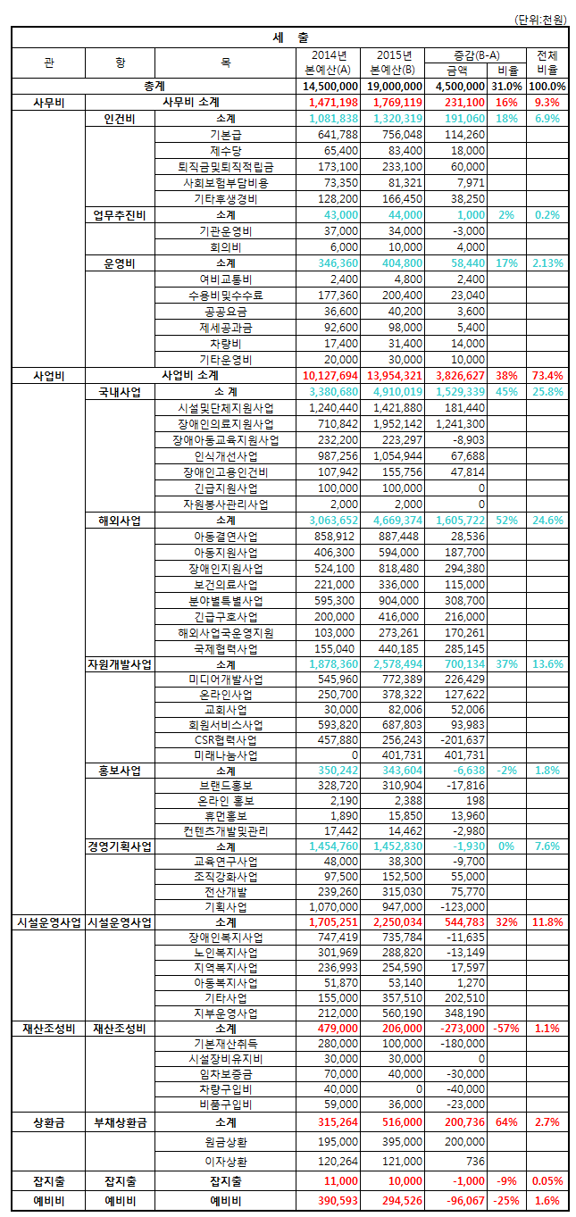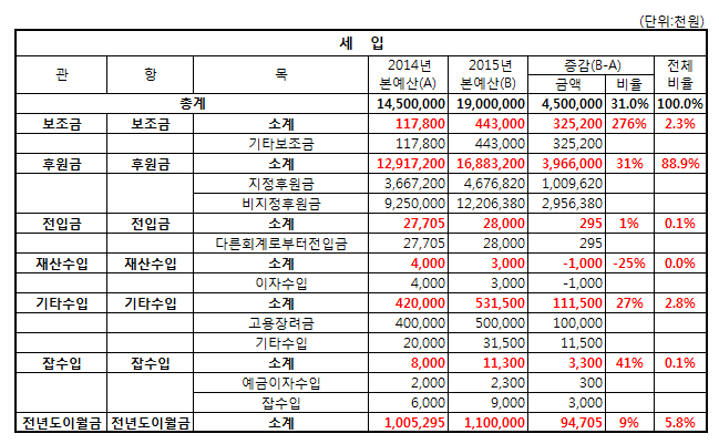 사회복지법인 재무회계규칙 제10조에 의거하여, 2015년 세입·세출 예산 개요를 아래와 같이 공고 합니다.