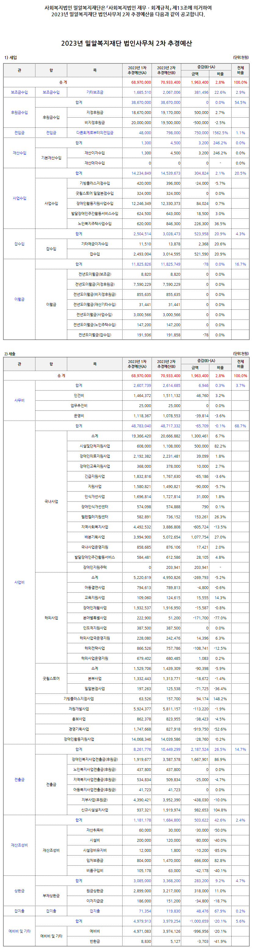 2023년 밀알복지재단 법인사무처 2차 추가경정예산 공고