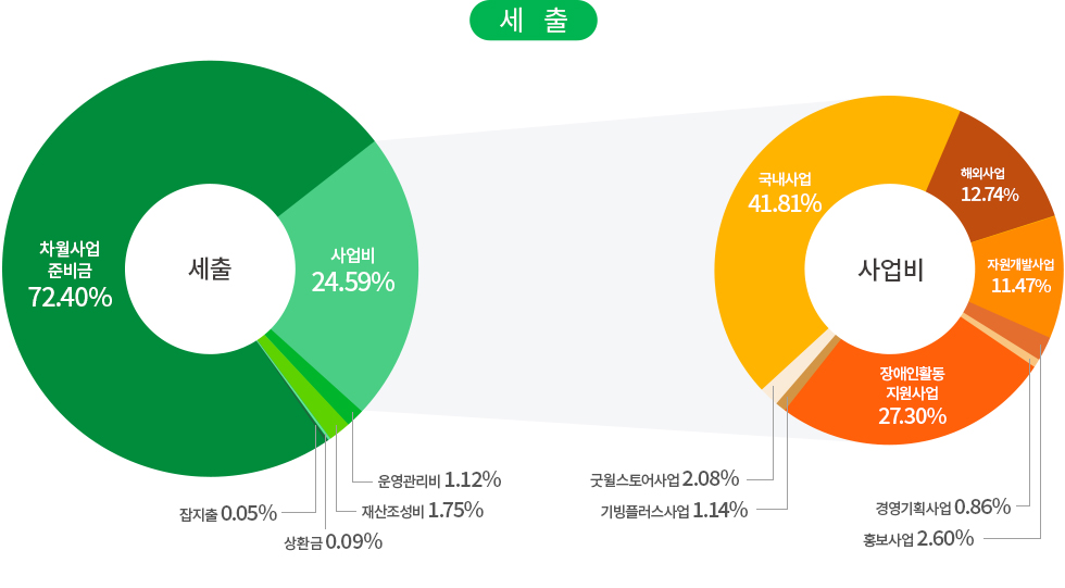 | 사업비 | 국내사업 | 국내아동결연 및 보육, 장애인의료 및 교육지원, 저소득가정 지원, 다문화가족 지원, 노인복지 사업, 지역사회복지 사업, 인식개선 사업, 발달장애인 작가양성지원 사업, 발달장애인 주간활동 서비스, 장애인인식개선센터, 헬렌켈러지원센터 |