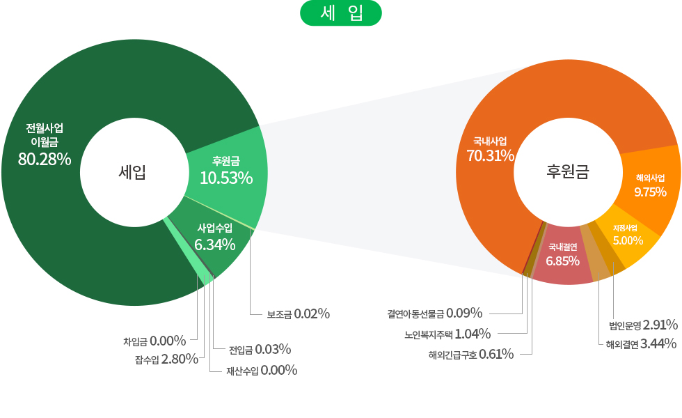 | 사업비 | 국내사업 | 국내아동결연 및 보육, 장애인의료 및 교육지원, 저소득가정 지원, 다문화가족 지원, 노인복지 사업, 지역사회복지 사업, 인식개선 사업, 발달장애인 작가양성지원 사업, 발달장애인 주간활동 서비스, 장애인인식개선센터, 헬렌켈러지원센터 |