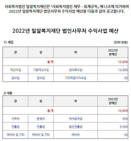 2022년 밀알복지재단 법인사무처 수익사업 예산 공고