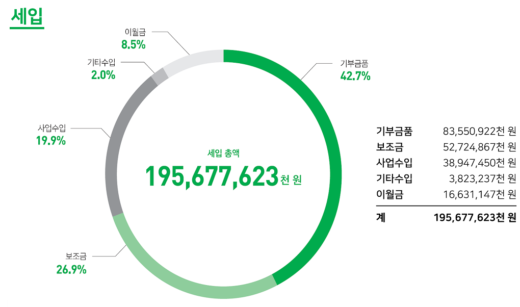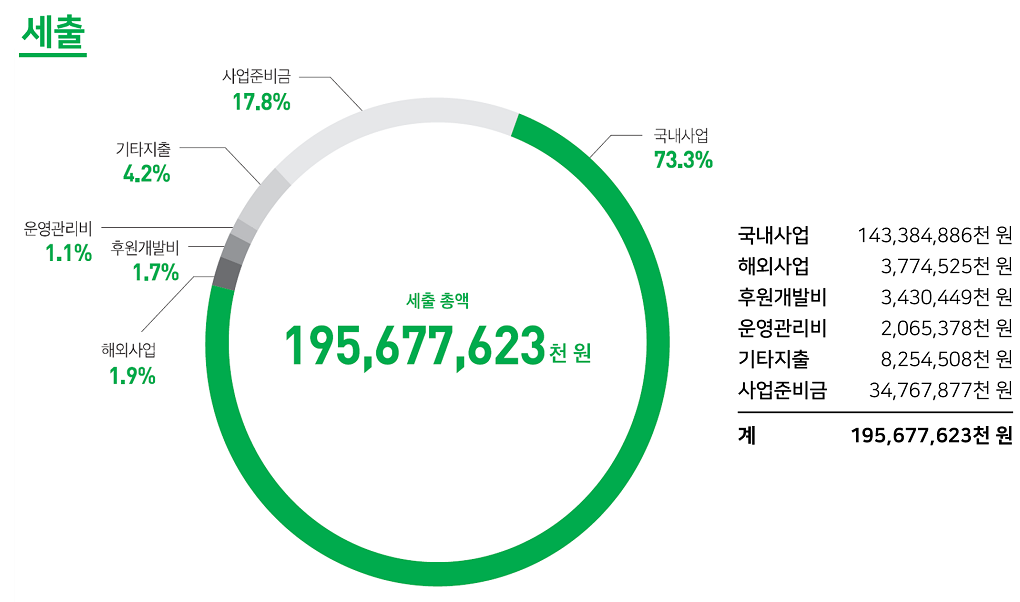 | 국내사업 | 국내 장애인복지사업, 아동복지사업, 노인복지사업, 지역사회복지사업 등 지원 | 21,489,942 | 25.7 |