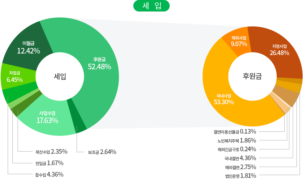 | 사업비 | 국내사업 | 국내아동결연 및 보육, 장애인의료 및 교육지원, 저소득가정지원, 다문화가족지원, 노인복지사업, 지역사회복지사업, 인식개선사업, 발달장애인주간활동서비스 |