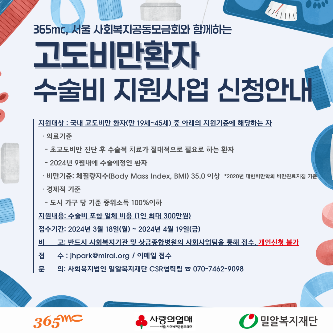 밀알복지재단과 365mc, 서울 사회복지공동모금회가 함께 저소득가정 고도비만환자를 대상으로 수술비를 지원하여 개인의 의지만으로는 극복이 어려운 고도비만 질환을 수술적 지원을 통해 극복하며 자유로운 일상을 되찾을 수 있도록 지원하고자 합니다. 지원 기관을 아래와 같이 모집하오니 많은 신청과 관심 바랍니다.