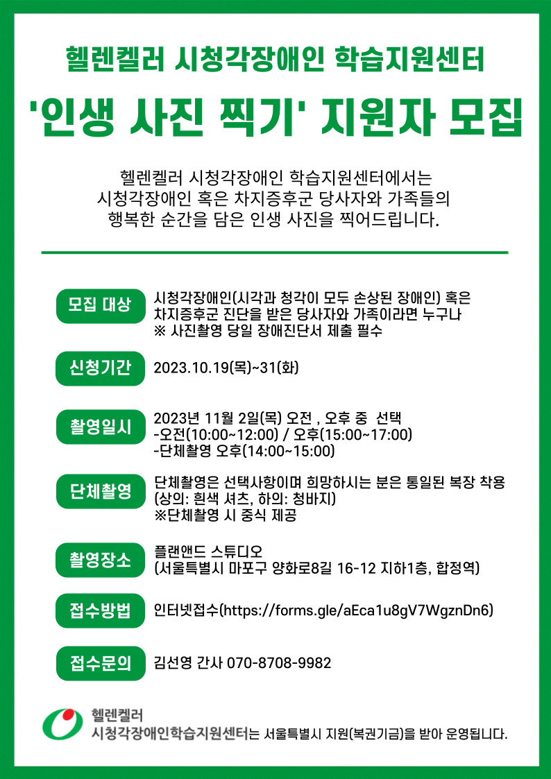 [마감] 헬렌켈러 시청각장애인 학습지원센터 ‘인생 사진 찍기’ 지원자 모집 (~10/31)