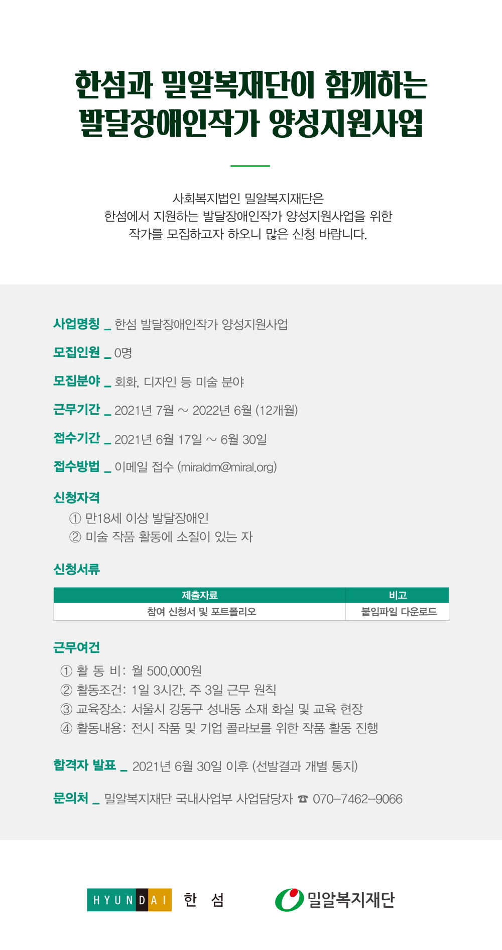 사회복지법인 밀알복지재단은 한섬에서 지원하는 발달장애인작가 양성지원사업을 위한 작가를 모집하고자 하오니 많은 지원 바랍니다.