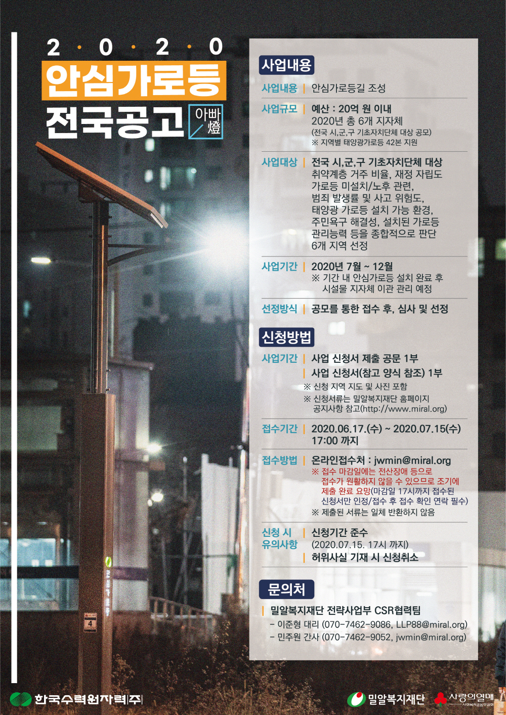 2020년 한수원 안심가로등 지원사업 전국 공모안내.hwp 2020 안심가로등 지원사업 공모 공고문(전국).hwp 2020 안심가로등 지원사업 신청서(전국).hwp