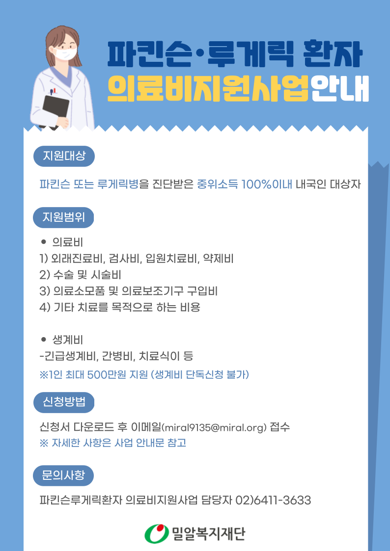 [마감] 파킨슨루게릭 환자 의료비지원사업 대상자 모집 안내