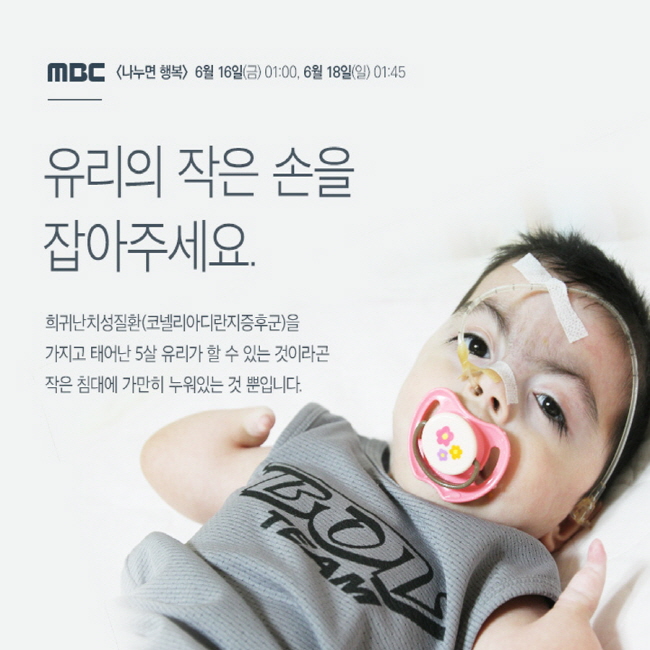 희귀난치성질환을 앓고 있는 5살 유리는 아직 혼자서는 할 수 있는 것이 아무것도 없습니다. 어려운 가정환경에도 불구하고 유리의 부모님은 유리의 건강을 위해 최선을 다하고 있습니다.