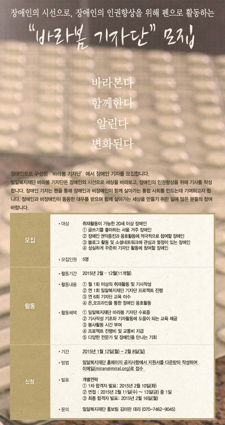 밀알복지재단 장애인기자단 '바라봄' 기자모집