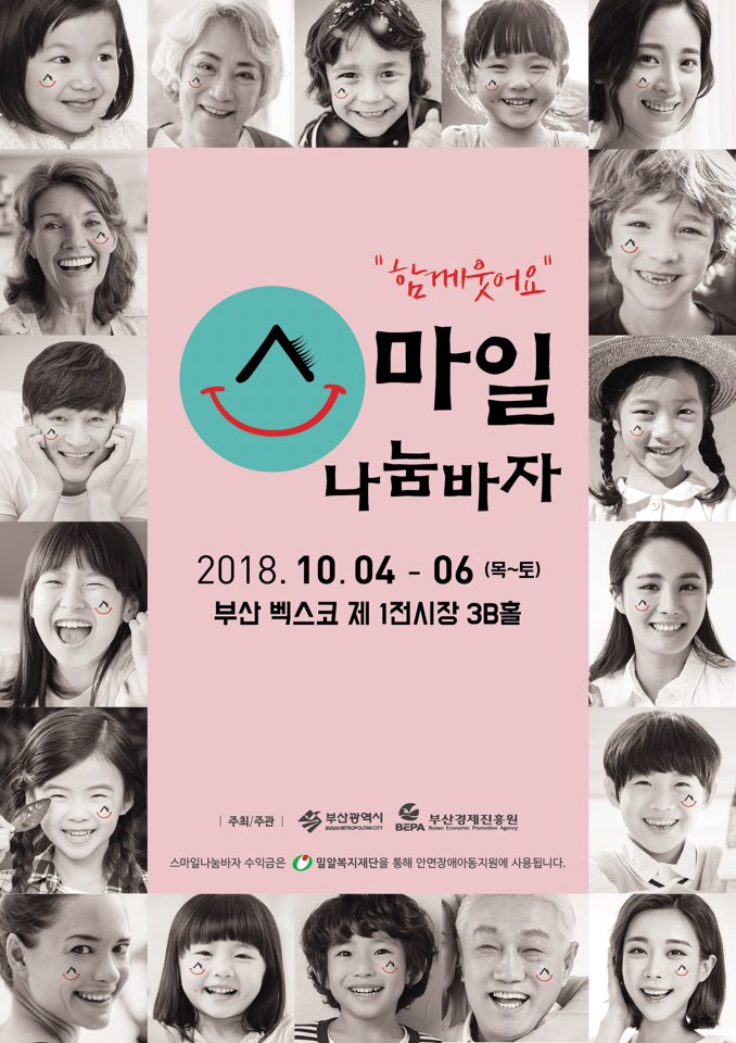 안면장애아동의 의료비 지원을 위한 <스마일나눔바자>가 10/4(목)~6(토) 부산 벡스코에서 개최됩니다.<스마일나눔바자>를 위해 디자이너 카이타조, 아트테이너 솔비, 배우 조동혁, 윤선우, 엔터테이너 하하 등 많은 셀럽이 함께할 예정입니다. 많은 분들의 참여와 관심 바랍니다. 함께 웃어요, 해피스마일!