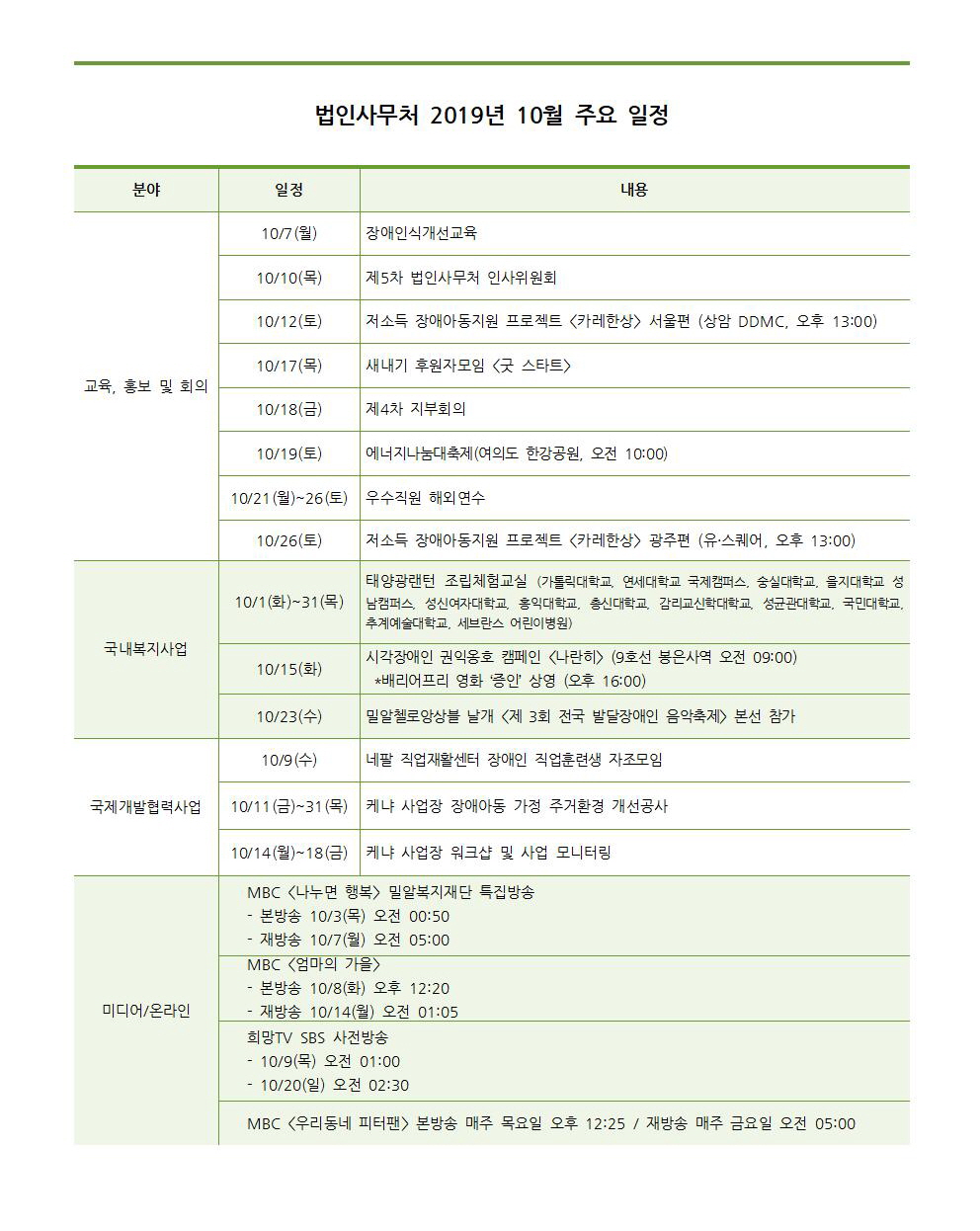 법인사무처 2019년 10월 주요일정