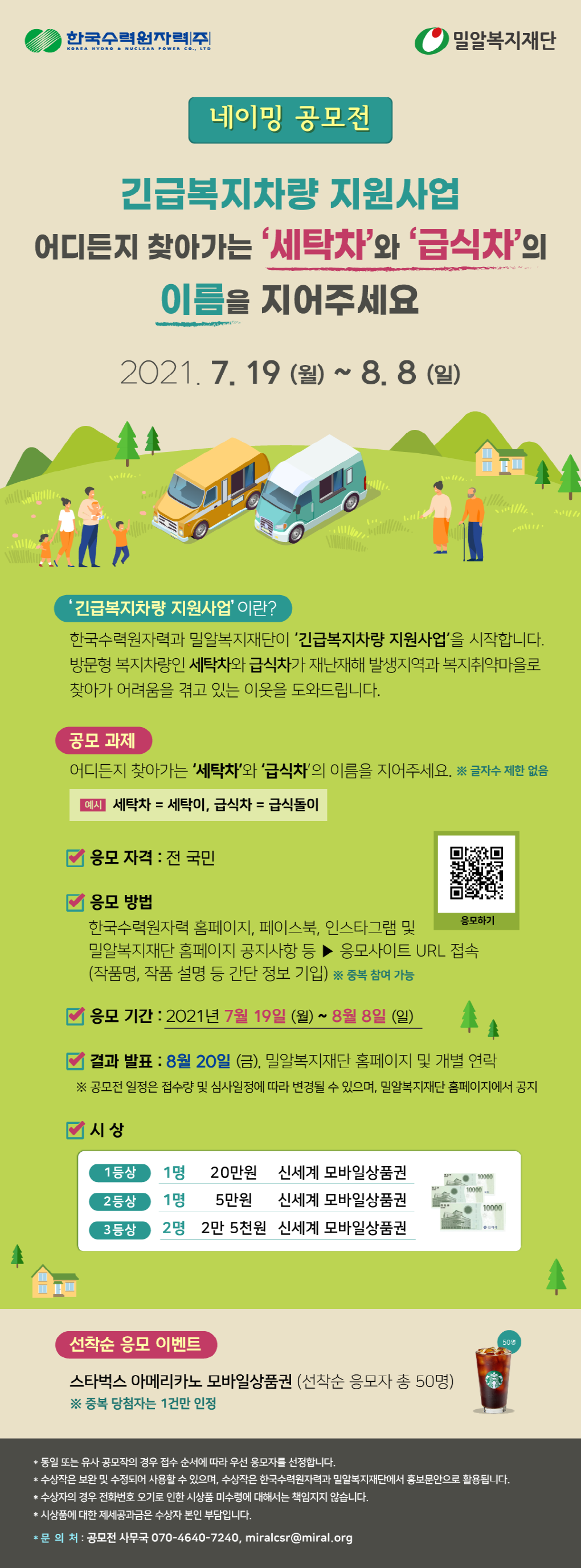 : 어디든지 찾아가는 ‘세탁차’와 ‘급식차’의 이름을 지어주세요.(글자 수 제한 없음)