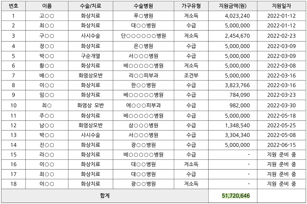 2022년 상반기 집행한 안면장애인 의료비 지원 사업 현황은 아래와 같습니다.