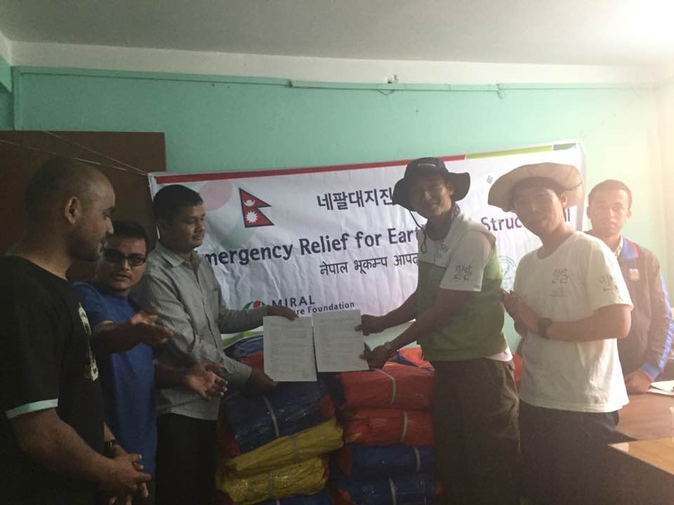 24일 (일)에는 돌라카 알람푸 지역에서 거처를 잃은 800가구 4,000여명에게 방수천막을 배분하였으며 , 네팔 현지 NGO 단체인 Concern Center for Rural Youth와 양해각서 (MOU)를 체결하고 네팔 긴급구호를 위해 긴밀한 공조를 이어가기로 하였습니다 . 이를 통해 접근이 어려워 지원의 손길이 닿지 못한 네팔 오지지역에 방수천막 (1,200개 )이 원활히 배분되도록 할 예정입니다 .