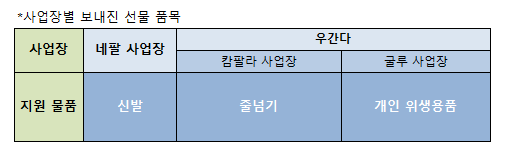 회원님의 사랑으로 아이들에게 소중한 선물이 전달되었습니다!지난 봄, 4월부터 5월까지 진행되었던 선물보내기 캠페인을 통해 51명의 회원님께서 총 2,800,000원의 소중한 선물금을 보내주셨습니다. 네팔, 우간다(캄팔라·굴루) 사업장의 아이들은 특별한 선물과 회원님의 사랑으로 더욱 풍성한 삶을 살 수 있게 되었습니다.