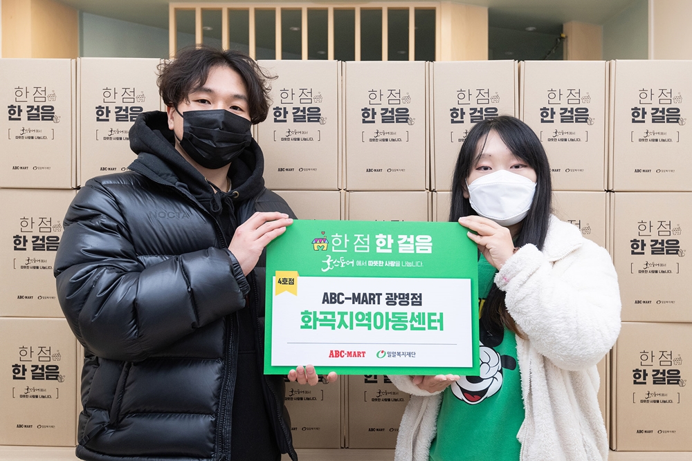 지난 12일 ABC마트 광명점 점장이 화곡지역아동센터 담당자에게 취약계층 아동과 청소년을 정기적으로 지원하는 ‘한 점, 한 걸음’ 캠페인 선물 키트를 전달했다.