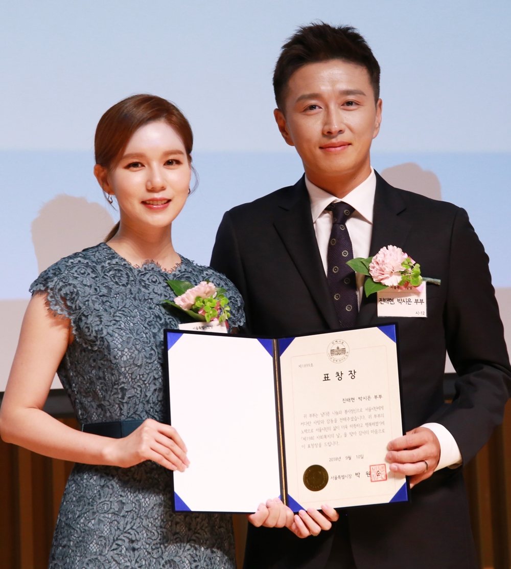 ▲2018 서울사회복지대회에서 서울특별시장상 받은 박시은-진태현 부부(사진제공=밀알복지재단)