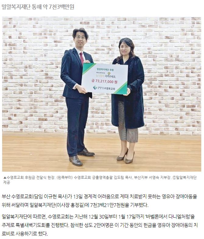 [크리스챤연합신문] 수영로교회, 장애아동 치료비에 7300만 원 기부