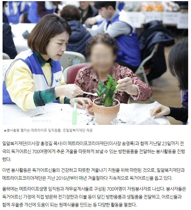 [크리스천투데이] “생활고에 외로움… 만성노인질환 어르신에 관심을” 밀알복지재단-메트라이프, 독거어르신에 방한용품 전달
