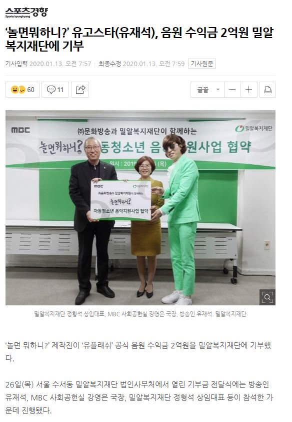 [뉴스엔] ‘놀면 뭐하니’ 유재석 음원수익금 2억원 밀알복지재단에 기부