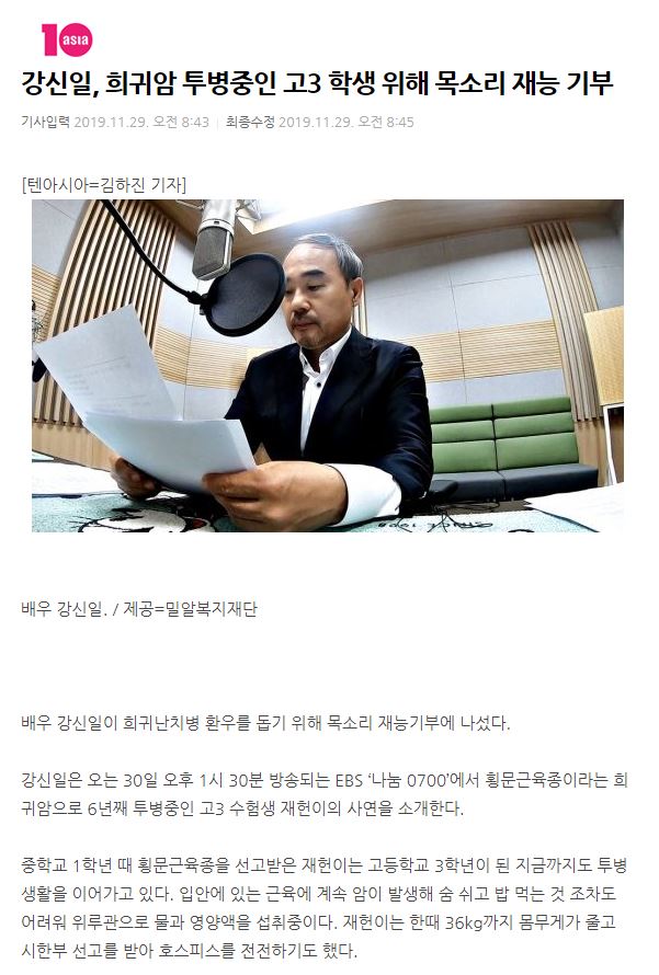 [텐아시아] 강신일, 희귀암 투병중인 고3 학생 위해 목소리 재능 기부