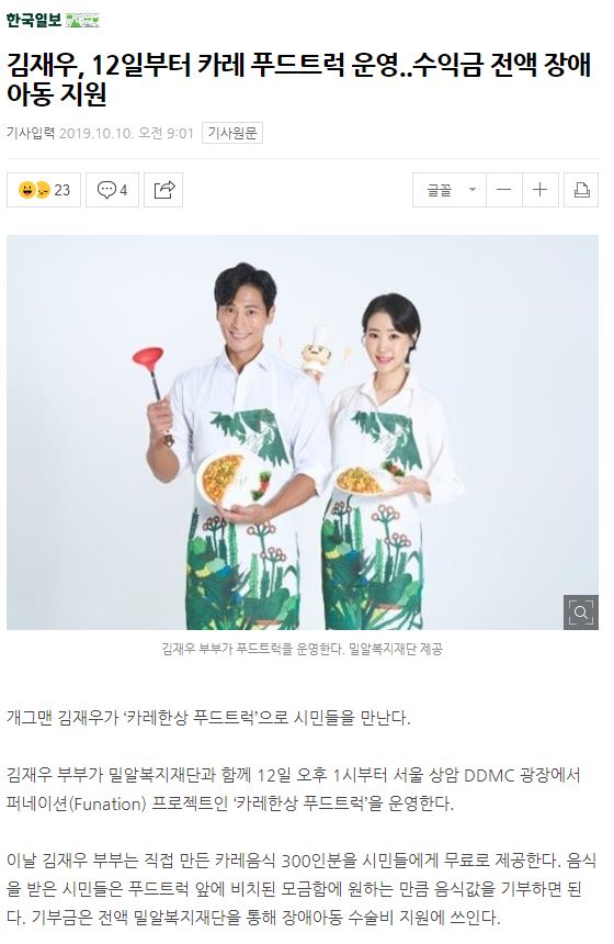 [한국일보] 김재우, 12일부터 카레 푸드트럭 운영..수익금 전액 장애아동 지원