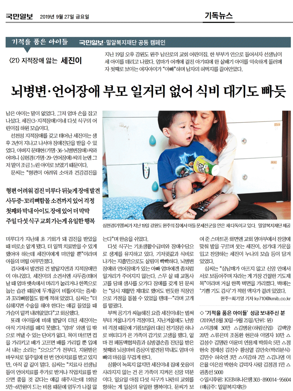 [국민일보][기적을 품은 아이들 <21>] 뇌병변·언어장애 부모 일거리 없어 식비 대기도 빠듯