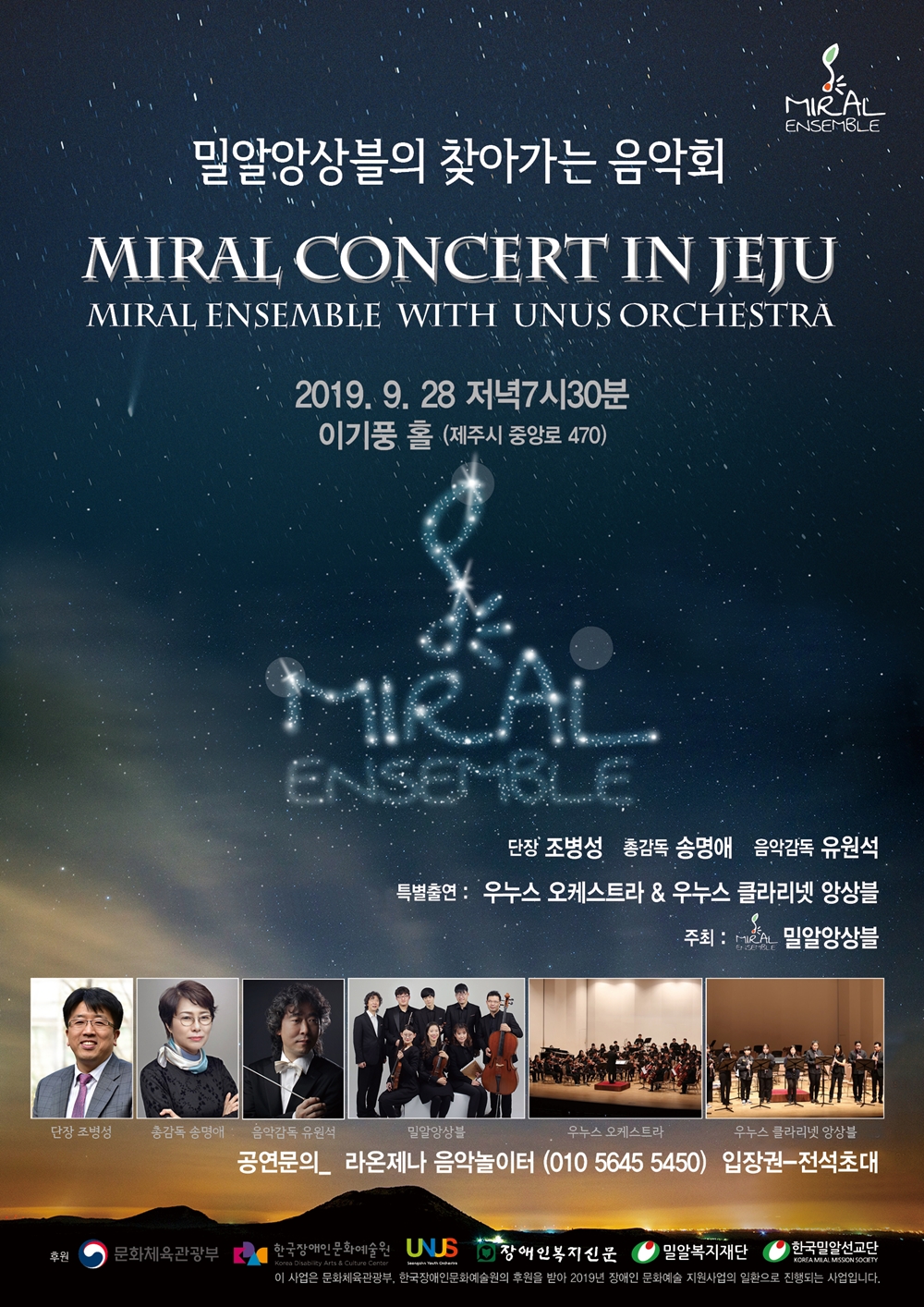 밀알복지재단(이사장 홍정길)에서 운영하는 밀알앙상블이 26일부터 29일까지 제주도 일대에서 ‘밀알앙상블의 찾아가는 음악회’를 개최한다. 장애인 연주자들의 저변확대와 장애인식개선을 위해 2010년 창단된 밀알앙상블은 바이올린, 비올라, 첼로, 플루트, 피아노로 구성된 클래식 앙상블이다. 음악을 전공한 장애인 연주자로 꾸려진 이들은 복지관, 교도소 등지에서 봉사연주를 펼치며 청중들에게 희망과 감동의 메시지를 전하고 있다.밀알앙상블은 이번 ‘찾아가는 음악회’에서도 제주도 내 장애인 시설 등을 찾아가 연주를 펼친다. ‘아리랑’과 ‘제주도의 푸른밤’ 등 우리 귀에 익숙한 대중가요와 민요, 클래식 명곡 등을 재해석해 들려줄 예정이다. 이밖에도 발달장애 1,2급 단원으로 구성된 스윗 프렌즈(Sweet Friends) 합창단과 온유한 크롬파이어, 제주를 기반으로 활동하며 장애·비장애 청소년으로 구성된 우누스 오케스트라, 우누스 클라리넷 앙상블과 협연을 펼친다. 장애인과 비장애인 연주자가 함께 만들어내는 클래식 선율은 관객들에게 깊은 감동을 선사할 전망이다.음악회는 제주개발공사(9/26), 제주시장애인복지관(9/26) 제주대학교병원(9/27), 이기풍기념홀(9/28), 제주드림교회(9/29)에서 진행된다. 전석 무료이며 공연장을 찾는 누구나 관람이 가능하다.한편 이번 공연은 한국장애인문화예술원의 지원사업으로 개최되었으며 문화체육관광부와 밀알복지재단, 한국밀알선교단, 장애인복지신문이 후원했다. (공연문의: 밀알앙상블 010-8933-6555)