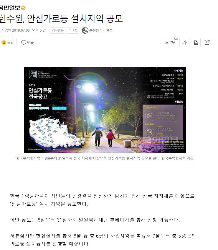 [국민일보] 밀알복지재단-한수원, 안심가로등 설치지역 공모