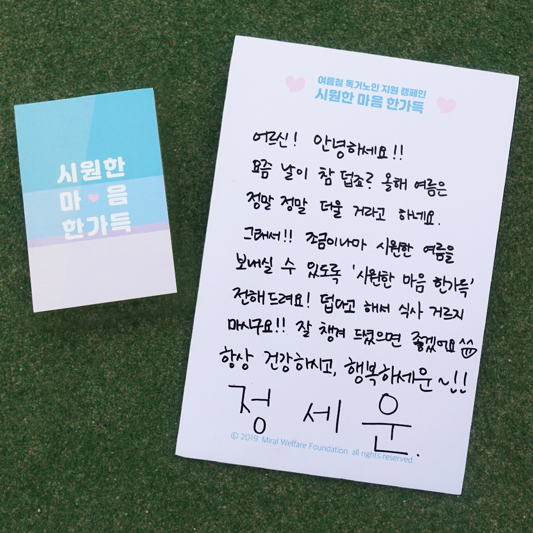 독거노인을 향한 관심과 지원 필요성에 공감하며 캠페인에 동참했다고 밝힌 정세운은 “어르신들이 시원하고 건강하게 여름을 보내셨으면 하는 마음”이라며 “많은 분들이 캠페인에 함께해주시면 좋겠다”고 말했다.
