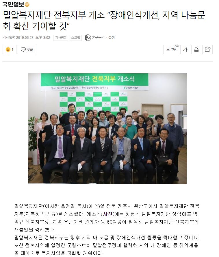 [국민일보] 밀알복지재단 전북지부 개소 “장애인식개선, 지역 나눔문화 확산 기여할 것”