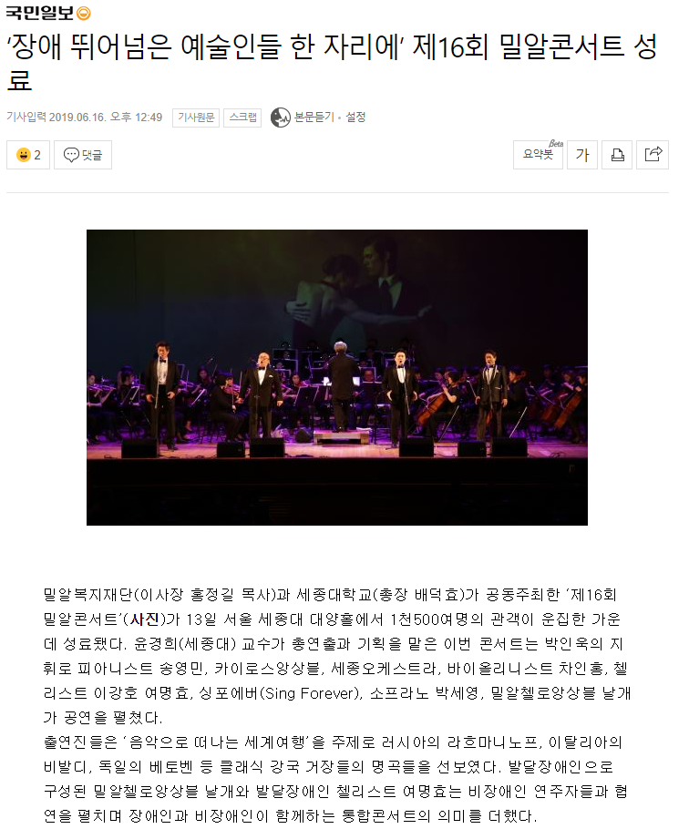 [국민일보] ‘장애 뛰어넘은 예술인들 한 자리에’ 제16회 밀알콘서트 성료