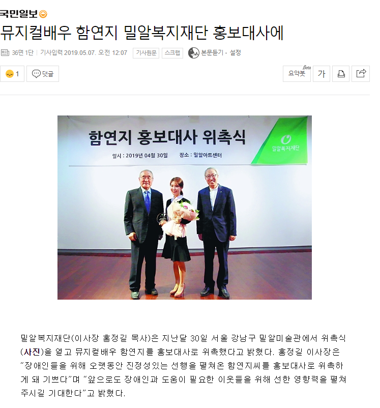 [국민일보] 뮤지컬배우 함연지 밀알복지재단 홍보대사에