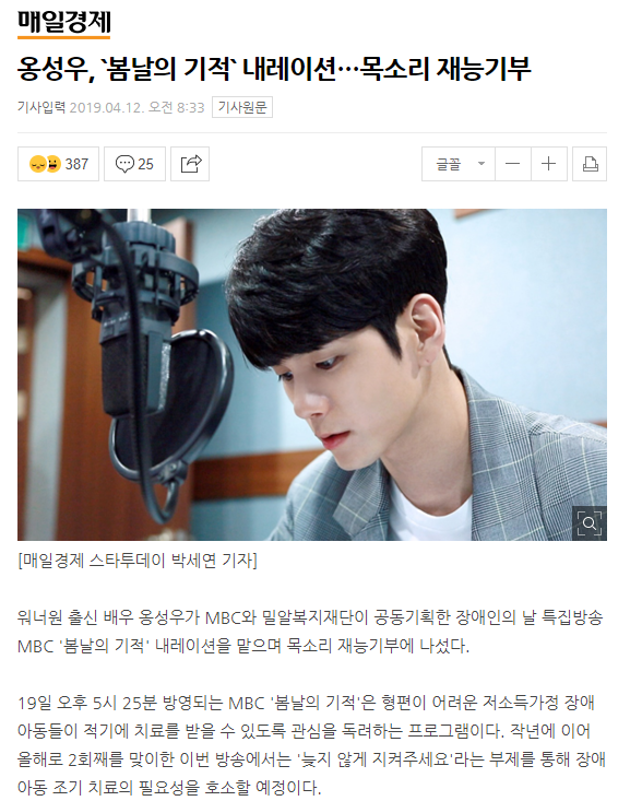 [한국경제TV] 옹성우, 장애아동 위한 목소리 재능기부…MBC ‘봄날의 기적’ 내레이션 참여