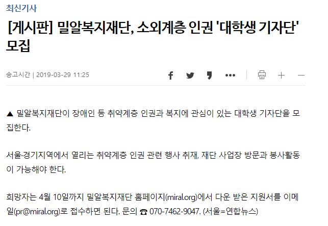 [연합뉴스] 밀알복지재단, 소외계층 인권 '대학생 기자단' 모집