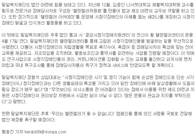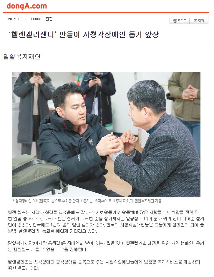 [동아일보] ‘헬렌켈러센터’ 만들어 시청각장애인 돕기 앞장