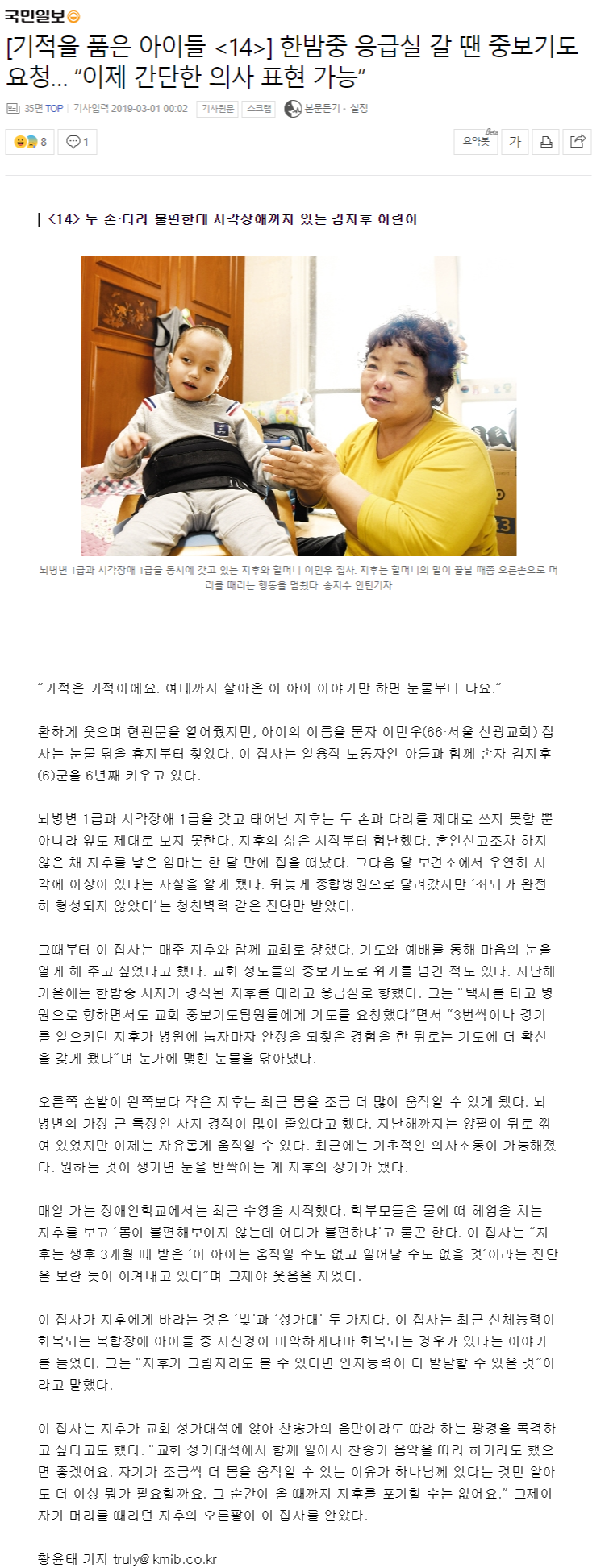 [국민일보] [기적을 품은 아이들 <14>] 한밤중 응급실 갈 땐 중보기도 요청… “이제 간단한 의사 표현 가능”